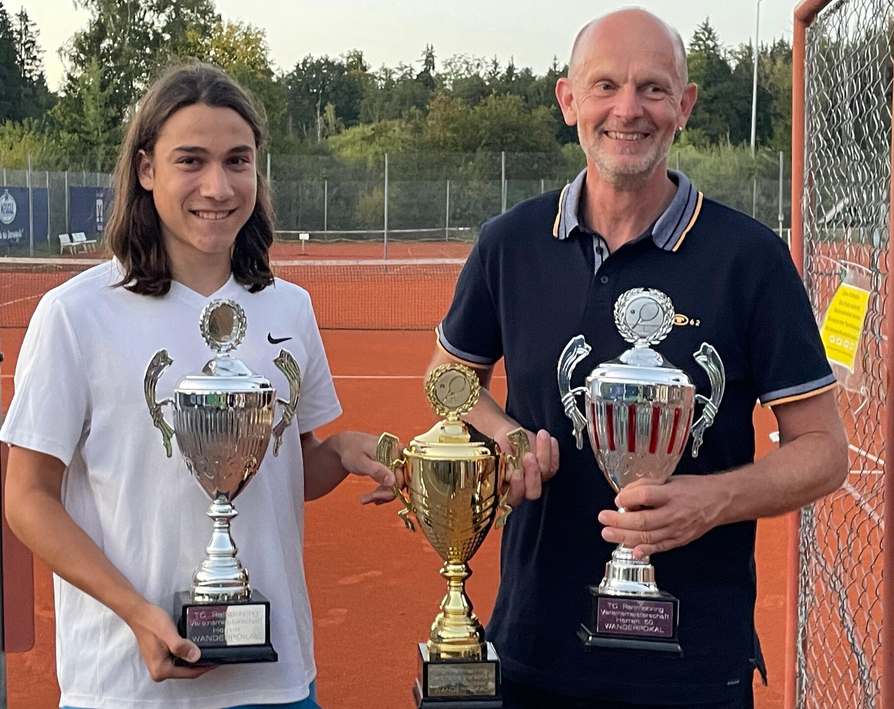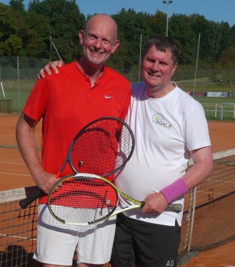 Im Einzel und Doppel der Herren schlug dann die Stunde der „glücklichen Verlierer“. Spieler, die eigentlich schon verloren hatten, bekamen durch zahlreiche Ausfälle wegen Verletzungen oder nicht wahrnehmbaren Spielterminen ihrer Gegenspieler eine zweite Chance. So bestritten Wolfgang Baumann und Dieter Achatz (6:1,6:1) das Herrenendspiel Ü50. Sie hatten schon in der Gruppe gegeneinander gespielt, da allerdings mit einem freundlicheren Ergebnis für Dieter Achatz.